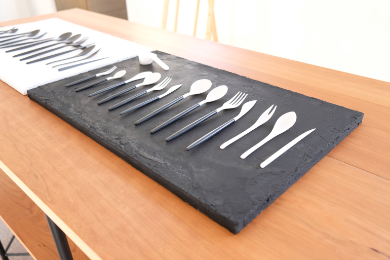 展示用の台を漆喰で作りました。モノトーンのカトラリーに合わせて、白と黒の台にしました。