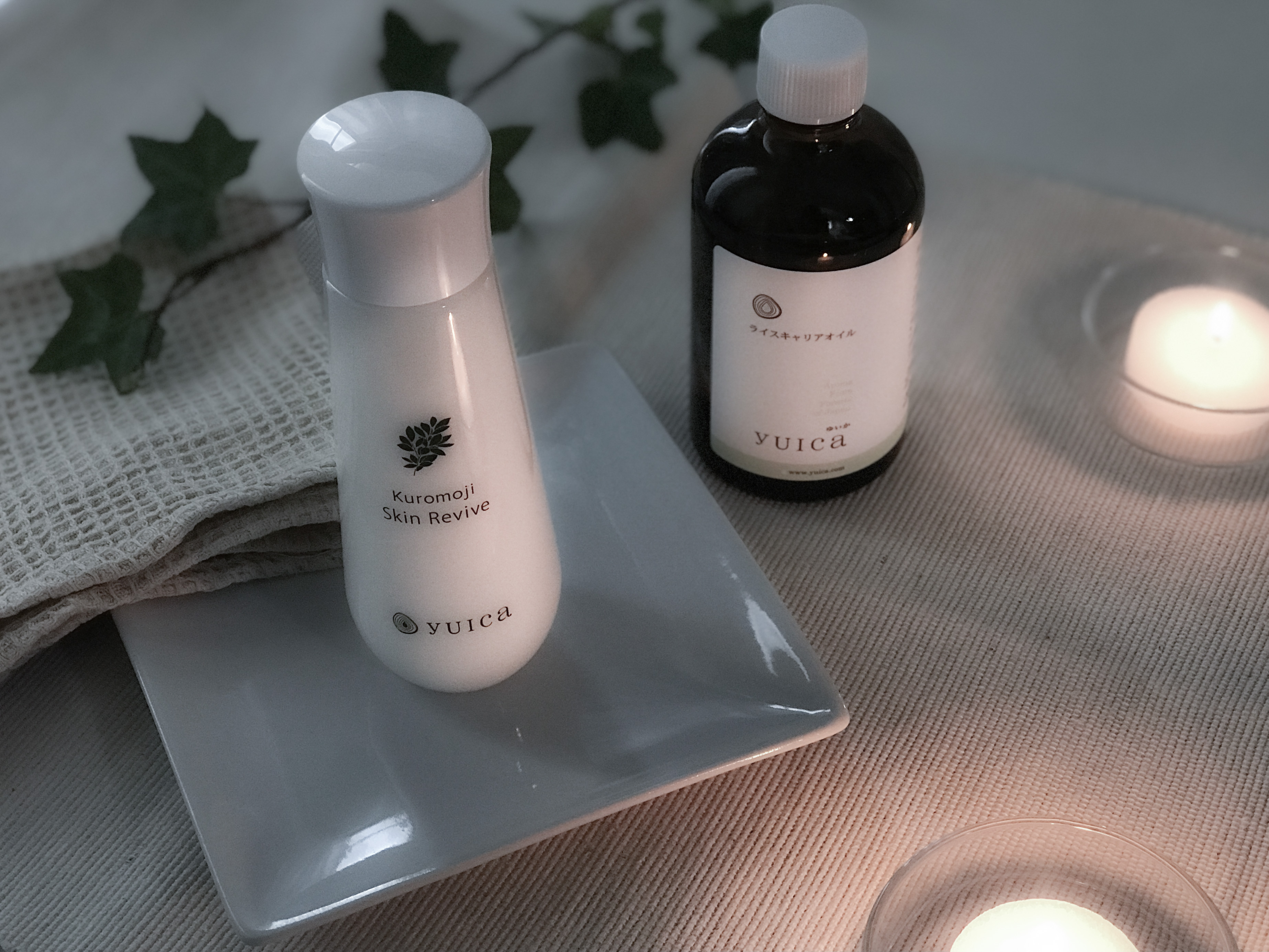yuicaの「黒文字 ナノエマルション化粧水」はクロモジのアロマウォーターとコメヌカ油が主成分。