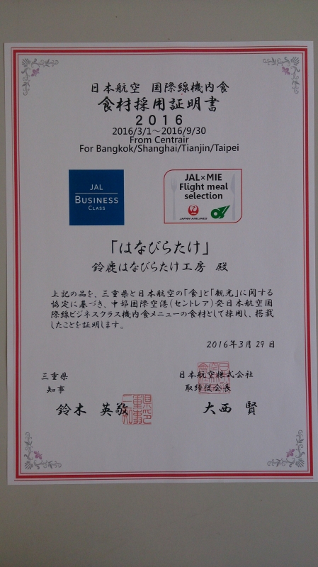 JAL様より、食材採用証明書をいただいております(≧∇≦)