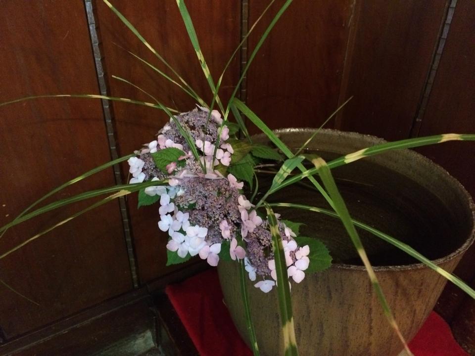 玄関の迎え花は矢筈すすきに満開の甘茶。