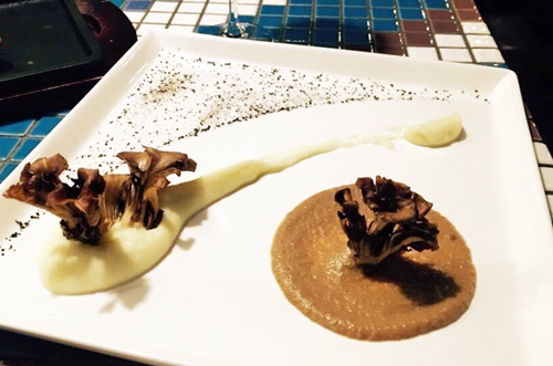 フランス産の丸鶏をオーブンでじっくりと焼き、舞茸と ジャガイモのソースをかけたものになります。 ご予約限定で1匹分2600円です。