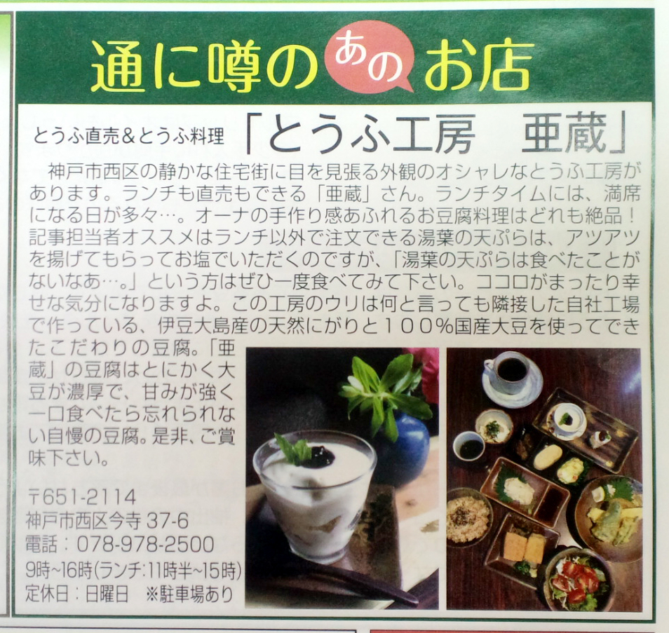 フリーペパーの「おひさまLIFE」に、通に噂のあのお店として尾崎食品株式会社自社工場敷地内にある直営店「とうふ工房亜蔵」を掲載していただきました。