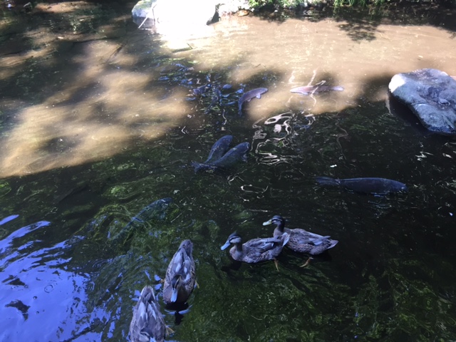 個室のお食事処の隣には池があり、鯉とカモが泳いでいます。このカモは、南阿蘇の農家が合鴨農法で使用したカモを引き取って飼っています。