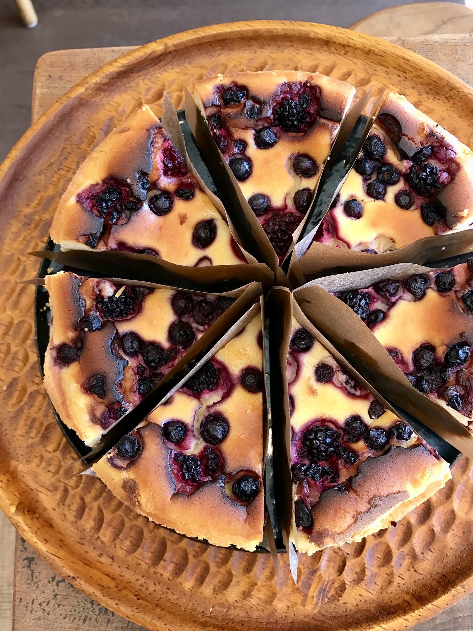 北海道産のクリームチーズとサワークリームをふんだんに使った濃厚チーズケーキの生地に、伊達「くさばたけ農場」の無農薬ブラックベリーと、壮瞥「岩倉果樹園」さんのブルーベリーをあわせています。自分で作っておいてなんですが、とっても贅沢なチーズケーキです(笑)。