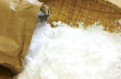 使いやすさを研究し、特製の平釜でゆっくりと丁寧に炊き上げました。 ふわっとしたフレーク状の結晶に仕上げた溶けやすく、固まりにくいあら塩です。