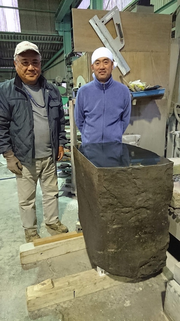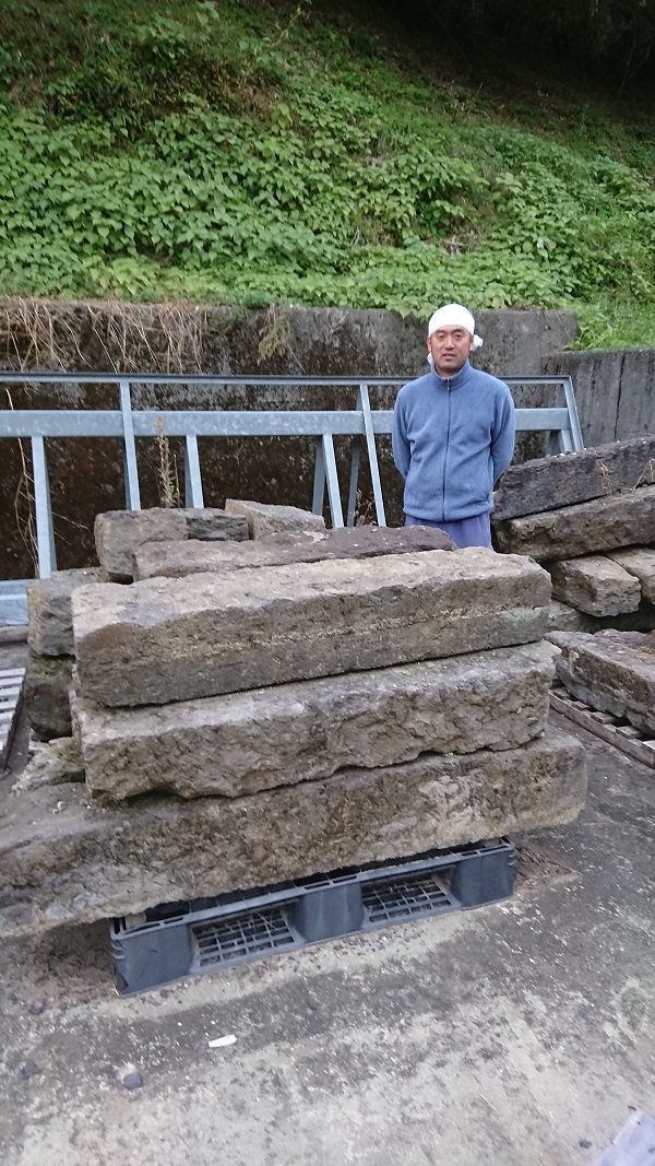 当町には日本を代表する石橋である通潤橋があります。通潤橋を作った種山石工は肥後の石工として名がとどろいております。特にその棟梁である橋本勘五郎は、通潤橋完成の後東京に呼ばれ、万世橋や皇居二重橋(異説あり)を作っています。当町にもその流れをくみ石工さんが多くおられます。今回のリノベーションに当たっては藤原石材さんに協力をお願いしています。藤原さんは親子で石材店を営んでおられ、地震後から弊蔵のために、解体された家屋から出る土台石(通潤橋と同じ材質です)を集めてもらってます。年明けから石畳や湧水の噴き出し石などの作業が徐々に始まります。皆さんの期待に応えられるよう藤原石工さん頑張ってもらってます。