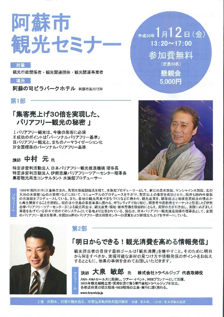 1月12日、阿蘇市観光協会の会長という立場で、阿蘇市と阿蘇温泉観光旅館協同組合の共催で、阿蘇市観光セミナーを開催いたしました。