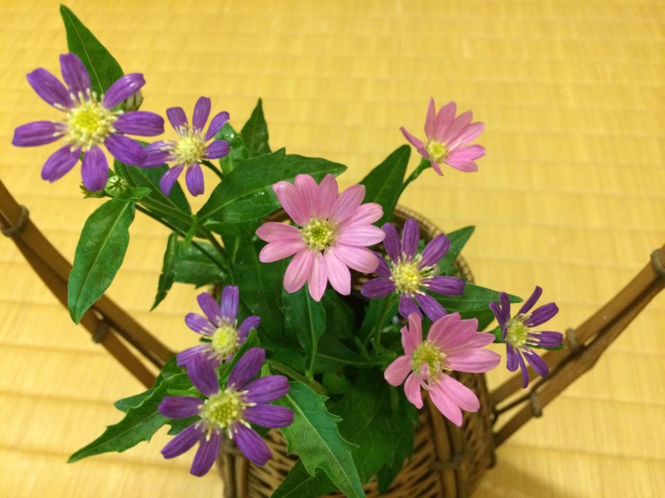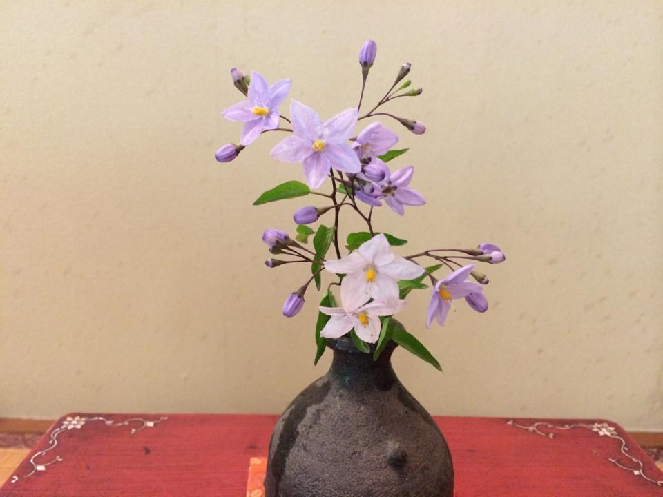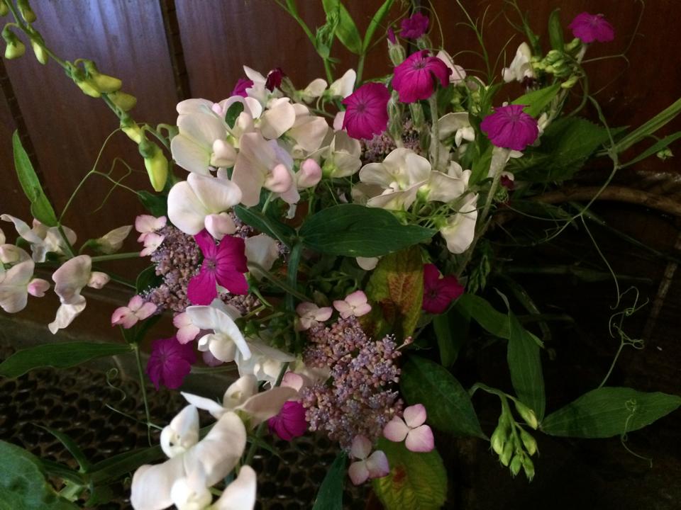 スイトピーや山紫陽花、都忘れ、八重のどくだみ、時計草など…。