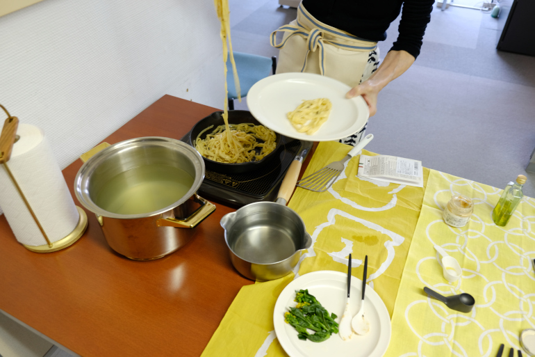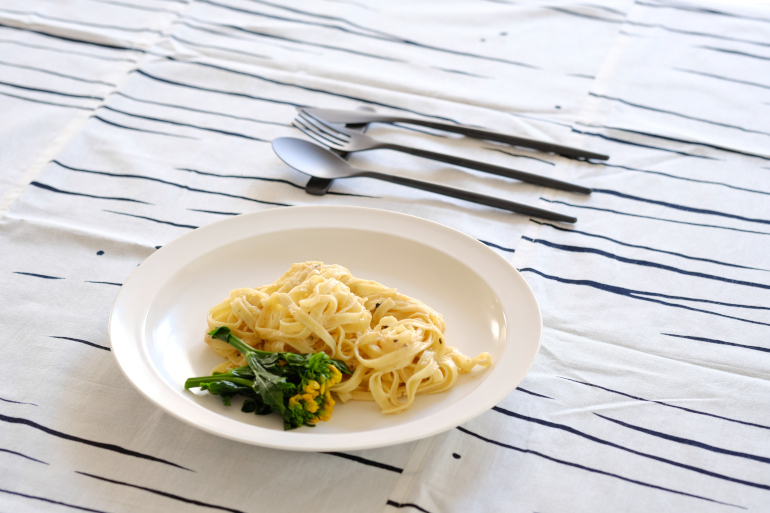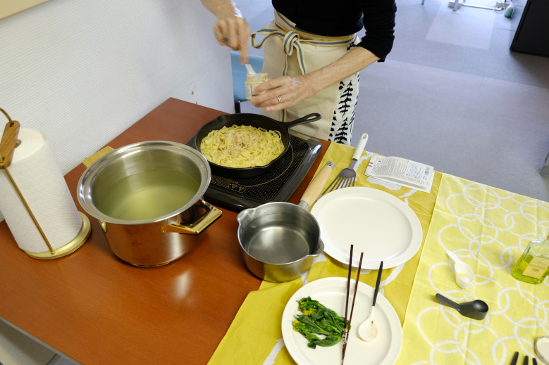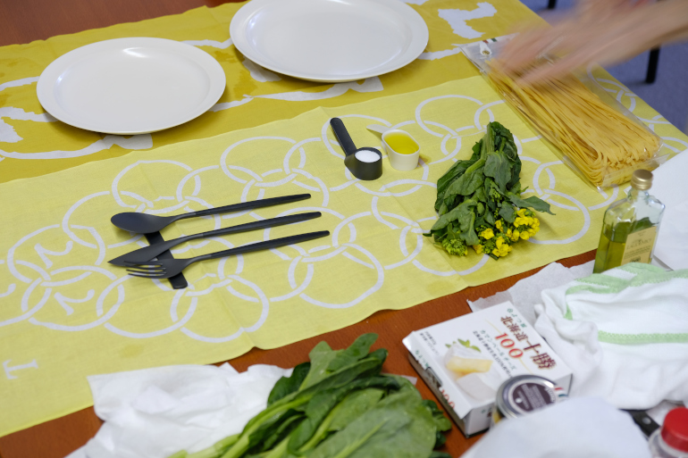 調味料をTEMOに入れて、パスタを用意しました。黄色い布は、ててて協同組合の手ぬぐいです。こちらも三布三用さんが作っています。