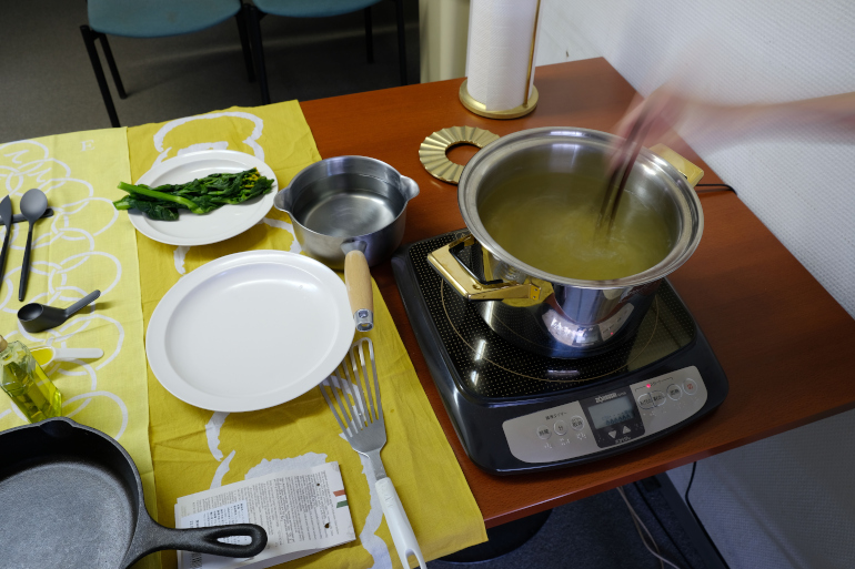 事務所で茹でてます。奥に写っているのは、FUTAGAMIさんのキッチンペーパー立てと鍋敷きです。