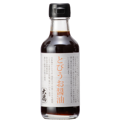 希少な国産丸大豆(熊本中球磨産)、 国産の小麦(地元兵庫産) 、崎戸島の平釜塩「にっぽんの海塩」を原料に、日本海のトビウオを醤油麹と合わせて丸ごと仕込んだ新しい魚醤。 化学調味料・合成保存料無添加、天然醸造・長期熟成でつくりました。