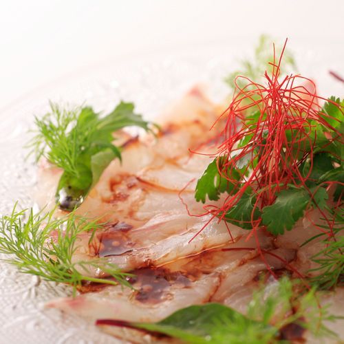 <材料・つくり方> うす造りにとびうお醤油・胡麻油(1:1)・豆板醤(適量)を混ぜたものをかけ、白髪葱・ハーブ系野菜をちらす。