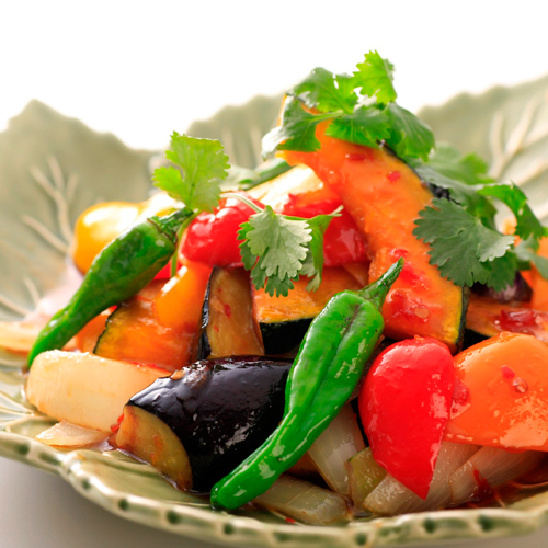 <材料・つくり方> かぼちゃ・パプリカ・なす等を素揚げにし、とびうお醤油・スイートチリ(1:6)に和える。