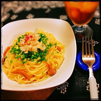 4.パスタが茹で上がったら茹で汁をきって3.に加え、バター、万能ねぎ、