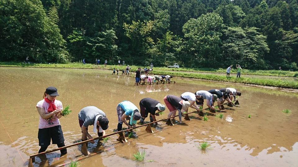 お米が繋げてくれた有志が集まり手植で苗を植えていきます。