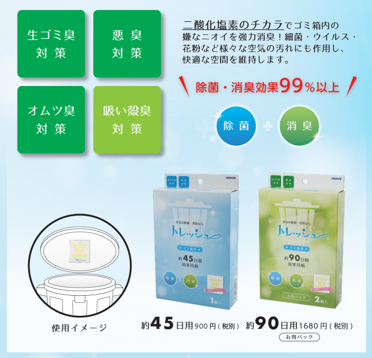 生ゴミ臭やお子様のオムツ臭など、トレッシュなら二酸化塩素のチカラでお悩みを解決します!