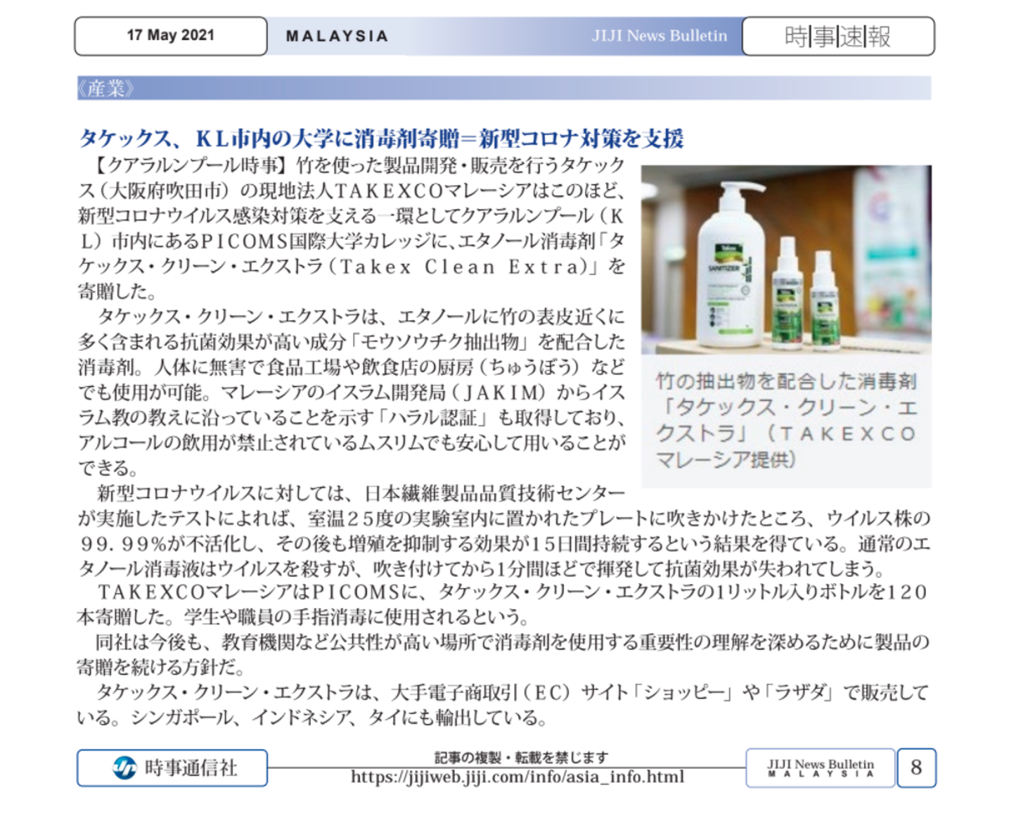 クアラルンプール市内のPICOMS 国際大学カレッジに高濃度アルコール製剤 Takex Clean Extra(タケックス クリーン エクストラ)を寄贈させていただきました。