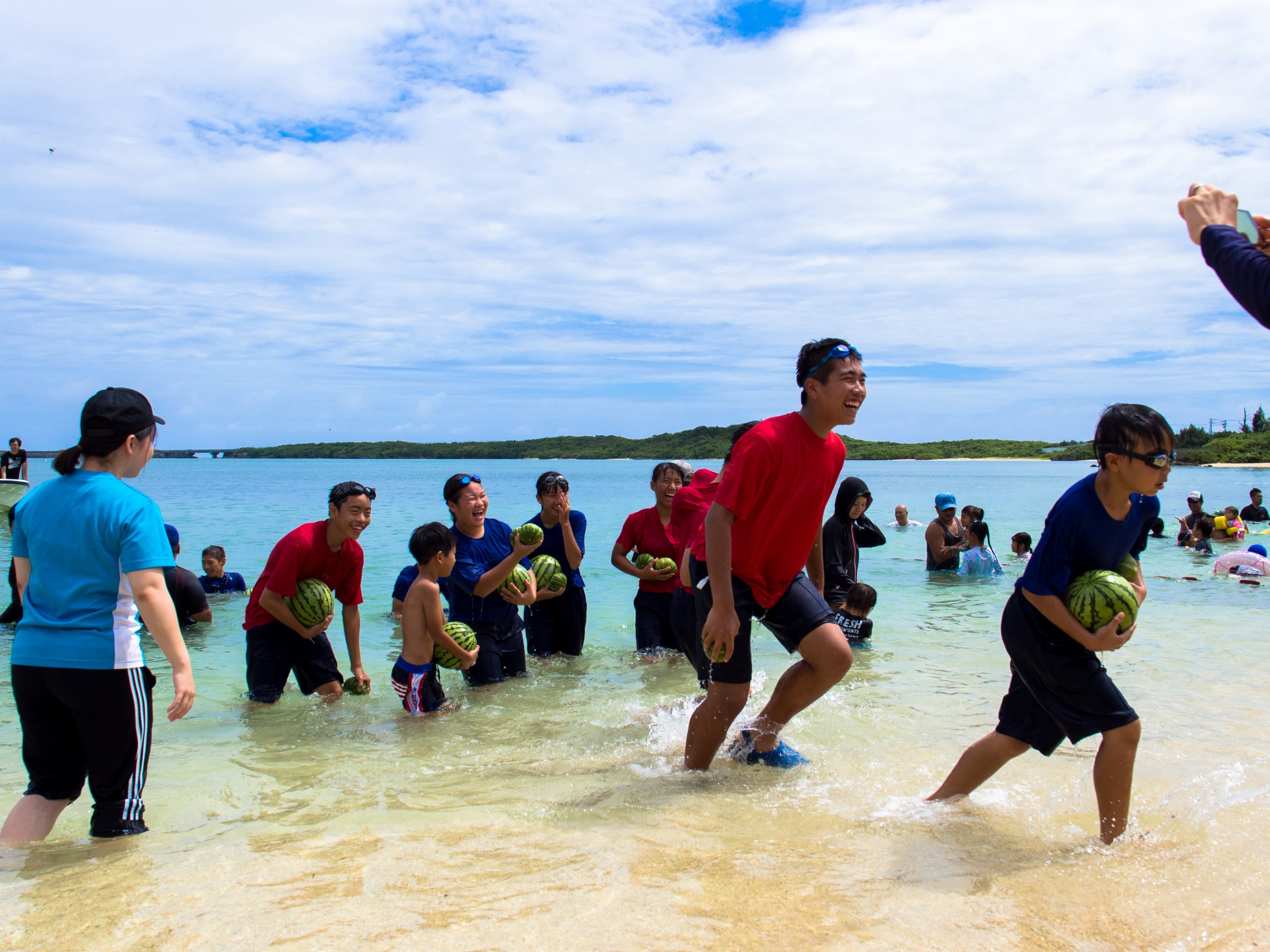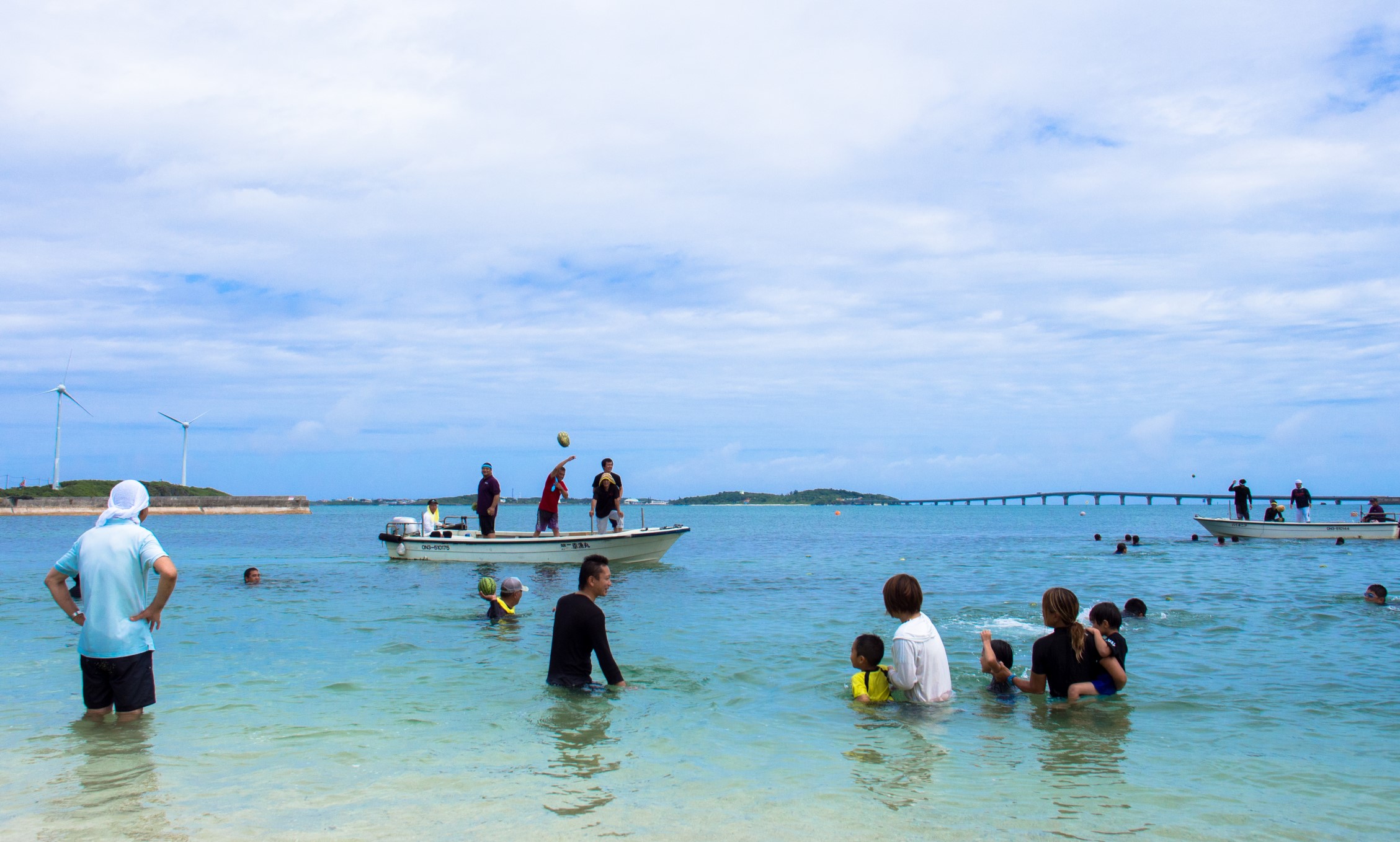 ハーリー競争の合間には、海中の子どもたちへ漁船の上からスイカ投げや、