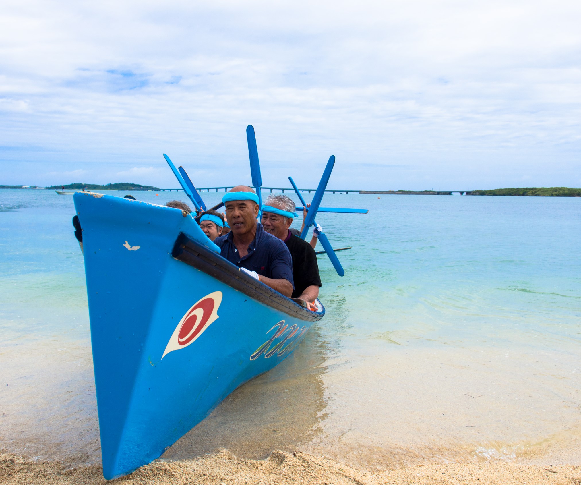 本プロジェクトメンバーは、海神祭実行委員を務める狩俣の区長さんへ連絡を取り、地域の方々へほんの少しですが、千代泉を携えて、地元の方々と一緒にハーリー船に乗り込んでハーリー競争を楽しんできました。