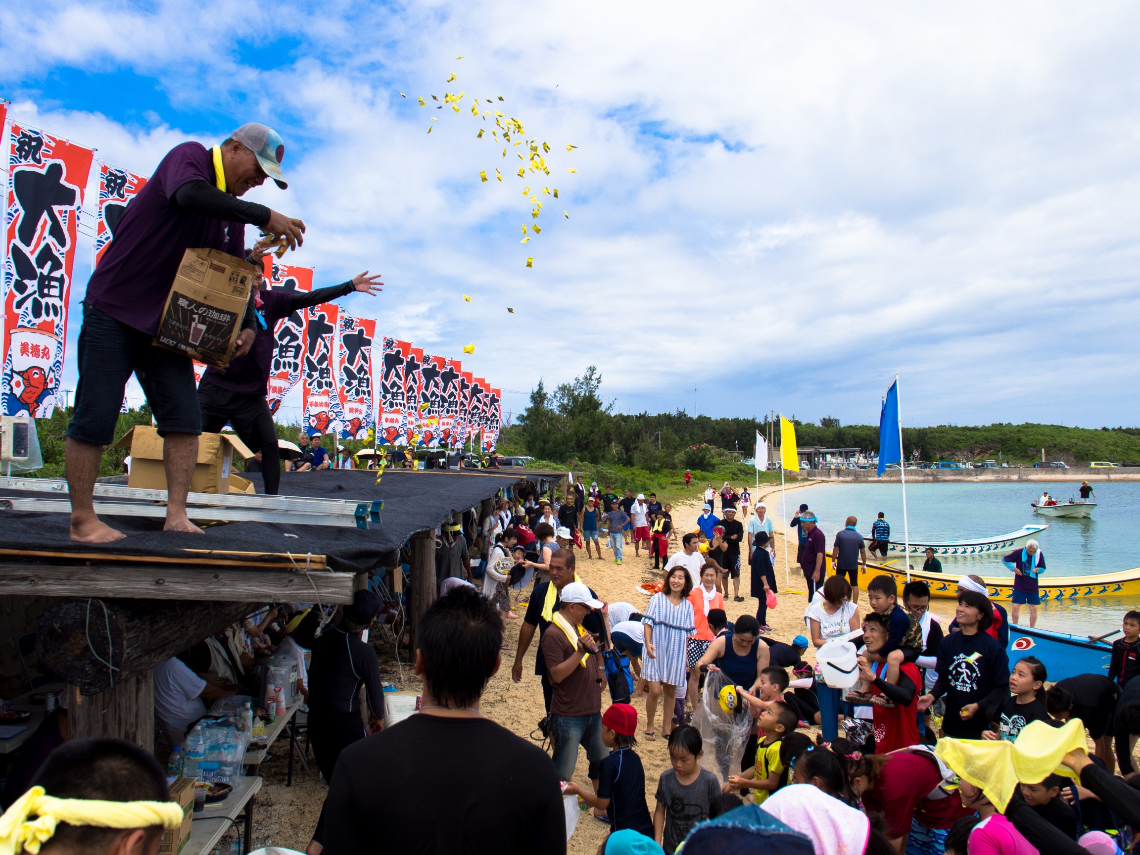 本部の屋根から砂浜の子どもたちへお菓子投げ。^^/