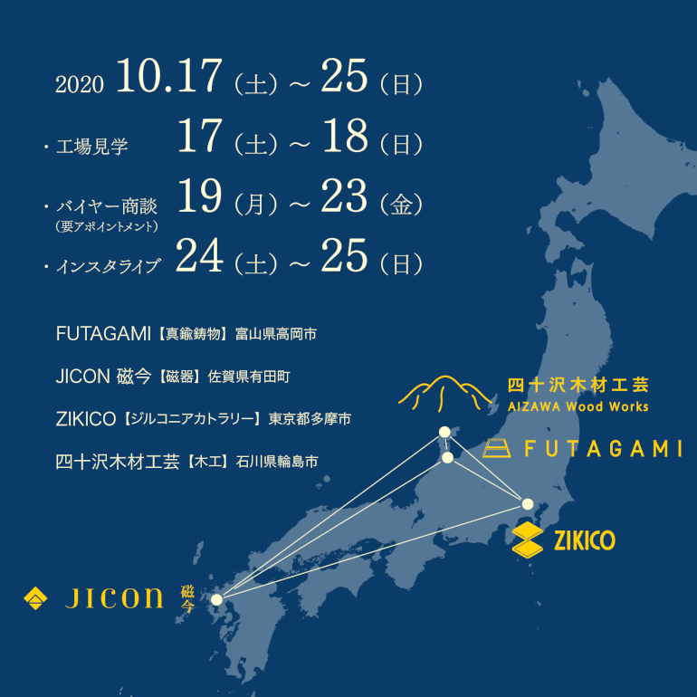 ファミリーといえるメーカー同士だからこそ、他社の商品でも作っている人の人柄まで説明できるような体温を感じる商品説明ができると思います。各地域にあるもっとも近いメーカーに小さな旅に出るつもりで見に行ってください。ひとつの工場でも4つのメーカーの愛情持って作られた新作に出会い繋がりを感じていただけると思います。ぞれぞれのメーカーの工場でそれぞれが独自の催しも行っています。感染予防を徹底して行っていますので、使い手の皆さん、伝え手の皆さん、是非繋がりに来てください。