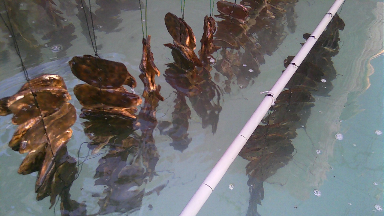 (今の養殖で貝殻の表面に海苔が出てきたところ)