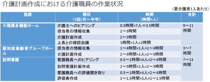 ①ケアプランの作成には多大な時間がかかり、ケアマネージャーの負担が大きい。