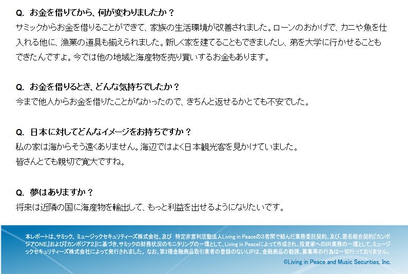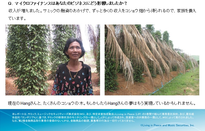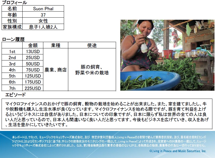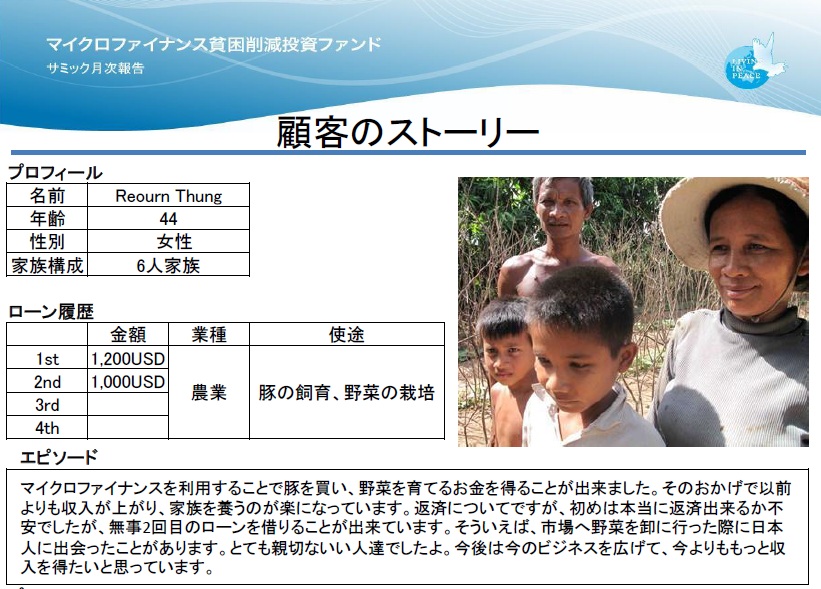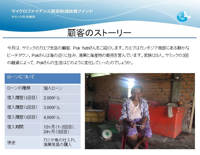 カンボジアのマイクロファイナンス機関サミックの顧客をご紹介いたします。サミックは、マイクロファイナンスファンド「カンボジアONE」と「カンボジア2」と「カンボジア4」の投資先です。