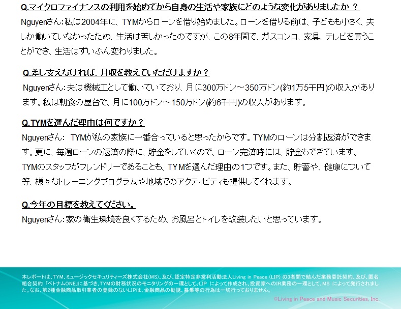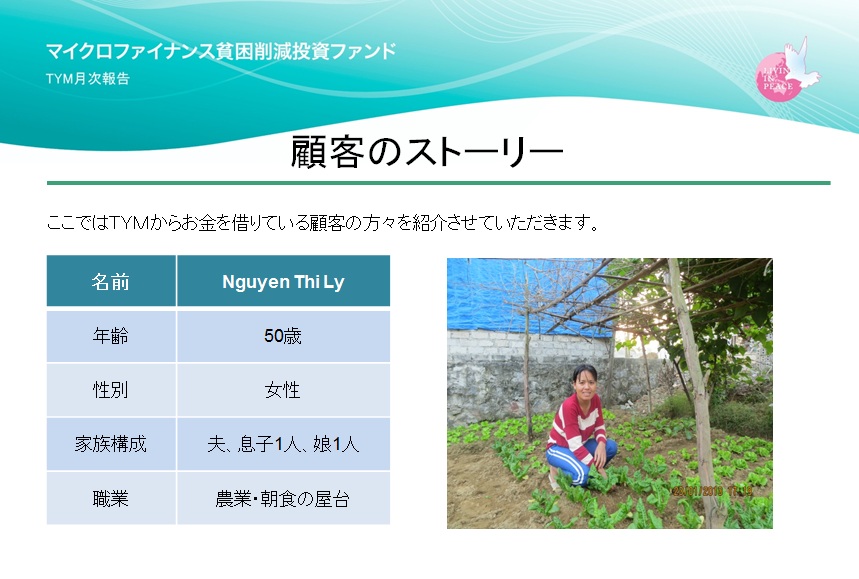 ベトナムのマイクロファイナンス機関「TYM」から事業資金を借入れている、Nguyenさんをご紹介します。TYMは、マイクロファイナンス貧困削減投資ファンド「ベトナムONE」の投資先です。