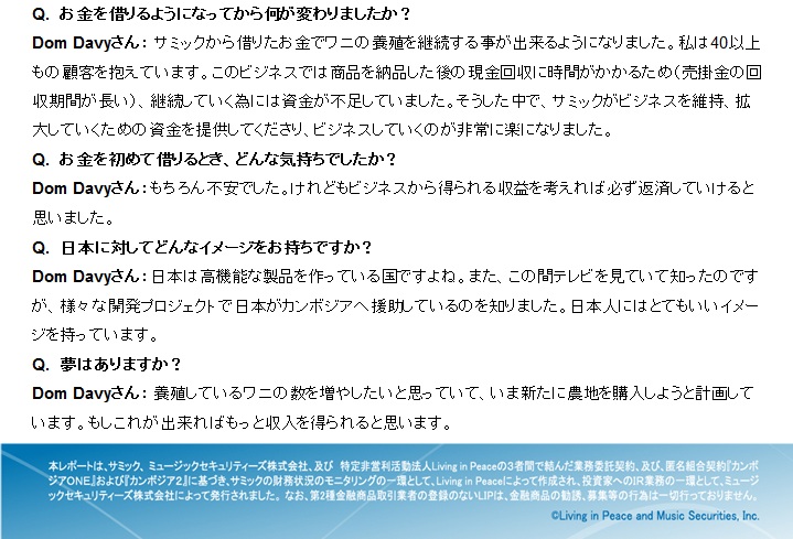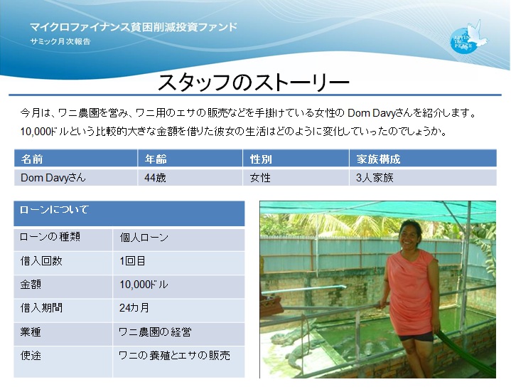 カンボジアのマイクロファイナンス機関「サミック」から事業資金を借入れている、Dom Davyさんをご紹介します。サミックは、マイクロファイナンス貧困削減投資ファンド「カンボジアONE」、「カンボジア2」、「カンボジア4」の投資先です。