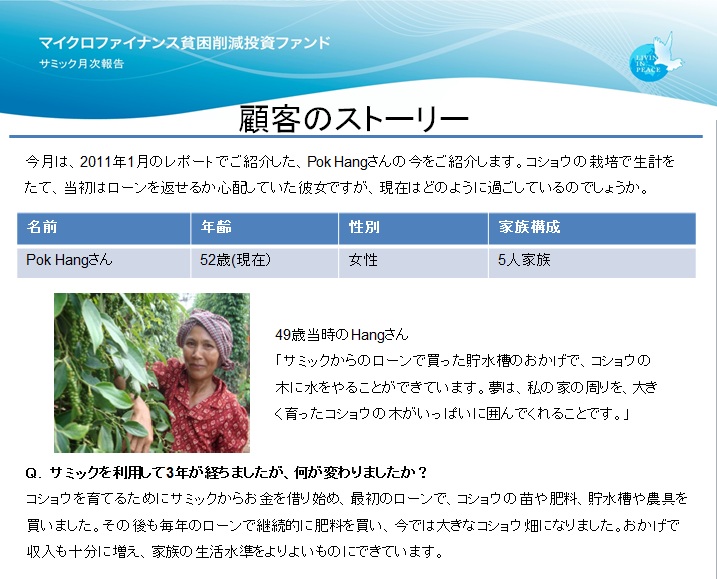 カンボジアのマイクロファイナンス機関「サミック」向けのファンドは約3年前から始まり、 これまで「カンボジアONE」「カンボジア2」「カンボジア4」と組成されました。 今回の顧客のストーリーでは、約2、3年前にインタビューした顧客へ、 再度インタビューしています。 2、3年たった今、「あの顧客は今どうしている?」をシリーズ化してお届けします。 2010年にインタビューしたPok Hangさんは、現在どのように過ごしているのでしょうか。