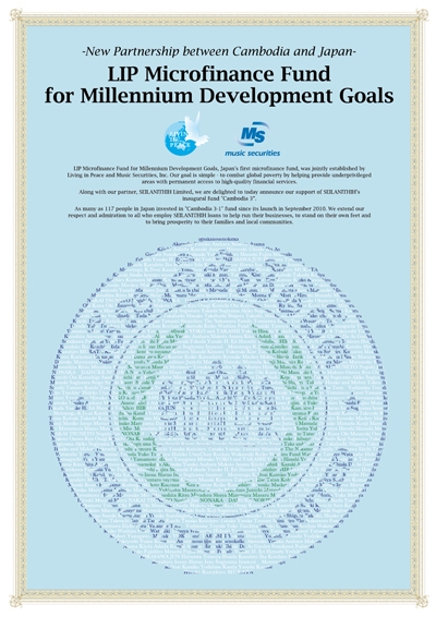 出資者の方のお名前やニックネームを記載した出資記念ポスターを作成しています。こちらのポスターはセイラニティのチャンカールー支店で掲示していただく予定です。このポスターによって、多くの日本の人々が、カンボジアを応援していることを、現地の人に、ささやかながらも知っていただければと思います。今回のデザインはこちらです!<ポスターデザイン>