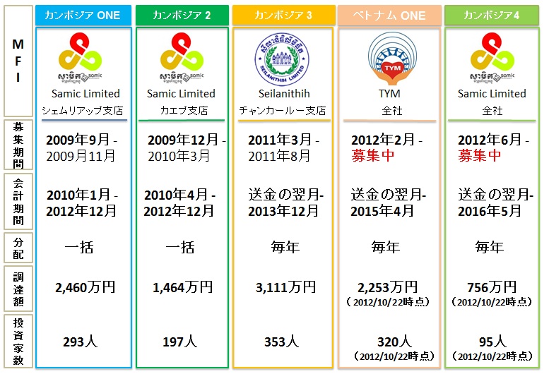 マイクロファイナンス貧困削減投資ファンドのこれまでの調達額が1億円を突破しました。1,200人を超える方々にご参加いただいています。2009年9月、日本初のマイクロファイナンスファンド「カンボジアONE」が始まって以来、マイクロファイナンス貧困削減投資ファンドは、これまで5本のファンドを組成してまいりました。カンボジアのマイクロファイナンス機関「サミック」と「セイラニティ」、ベトナムのマイクロファイナンス機関「TYM」へ資金が送られ、現地のより多くの方々への金融へのアクセスに繋がりました。