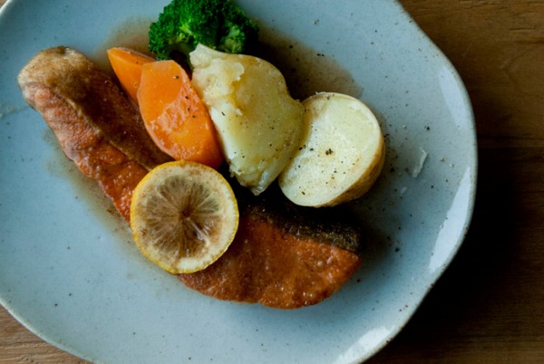秋鮭のレモンバター焼き獲れたての秋鮭を塩胡椒をしてバター焼きにしました。袋ごと湯煎で温めてお召し上がり下さい。