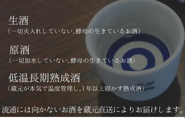 味:淡麗、やや辛口使用酒米:山田錦精米歩合:40%以下アルコール度数:16度~17度日本酒度:+3.0酸度:1.6アミノ酸度:1.0