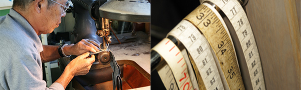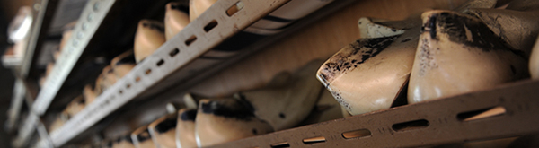 靴型に中底を取り付け製甲をつり込んでから表底を貼り付け、一度靴型を抜いて、表底と中底、製甲を一緒に縫いつけ(中縫い)ます。もう一度靴型を入れて、かかとを取り付けコバ仕上げをし、完成です。この靴の特徴は、履くと足をつつみ込む感じがし、そりかえりが良い為、まさに完全手造りならではのフィット感が味わえます。