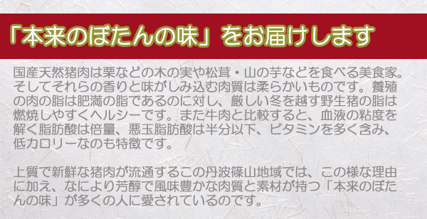 昭和24年、初代大見健が屋号「大見商店」として創業。当初はアイスキャンデーの製造販売をし、冬期の雇用対策として猪肉販売を始めたのがきっかけとなる。平成25年には自社の猪肉製品が兵庫県より「五つ星ひょうご」に選定される。現在、直販店舗・通販・卸し・飲食レストラン経営など猪肉の流通を広く手掛けている。