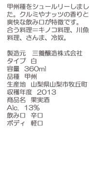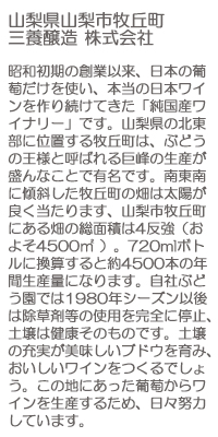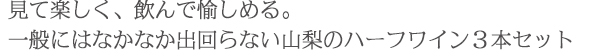 山梨県には日本酒を醸す酒蔵はもちろん、日本のワイン発祥の地でもあるため約80社(日本一)のワイナリーがあります。山梨県特産の甲州種ブドウで造られた白ワインは、和食に合う味わいが特徴で、和食ブームの海外でも注目を集めており、世界市場へのチャレンジも始まっています。今回の企画は山梨で日々研鑽する地元のワイナリー様を皆さまにより多くより知っていただくためにハーフサイズとし、生産地を山梨県産に絞り込んだシリーズ。