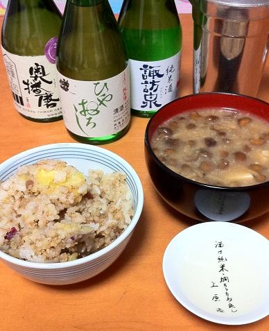 左下はさつま芋ご飯、右はお味噌汁、そして純米酒。