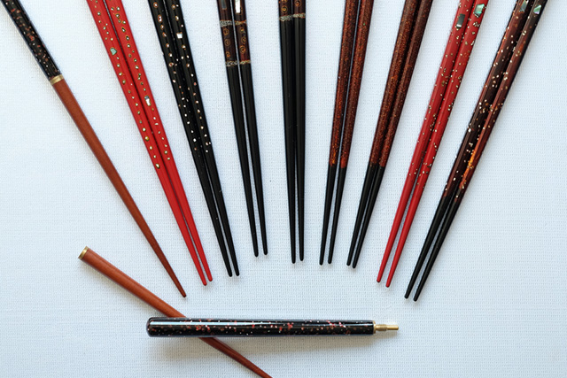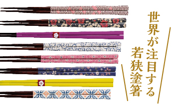 その歴史は古く、約400年前小浜藩の御用塗師「松浦三十郎」の作った箸が始まりとされ、長い歴史の中で、金銀箔や貝殻、卵殻を使い若狭湾の海底の美しさを表現するなど、様々な研ぎ澄まされた装飾技法を培ってきました。美しさと機能性を持つ若狭塗箸は、国内生産のトップシェアを誇るまでに発展しました。