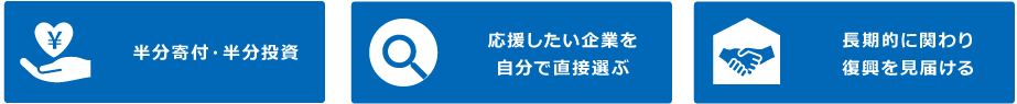 「for 復興 (425)」の願いを込めて、2011年4月25日に最初のファンドを募集開始しました。それ以降2014年8月までに38社、40本のファンドを募集しました。1口金額の半分は返済義務のない「応援金(寄付)」として、半分は事業の売上に連動して分配する「出資金(投資)」として、応援したい企業に直接届けることができる半分寄付・半分投資の仕組みを取り入れたファンドです。