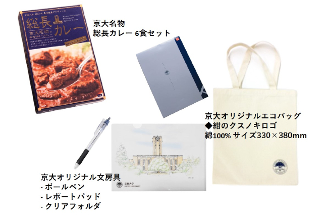 ※京大オリジナルグッズ詰め合わせ:総長カレー6食セット+文房具セット(ボールペン・クリアフォルダ・レポートパッド)+エコバッグ