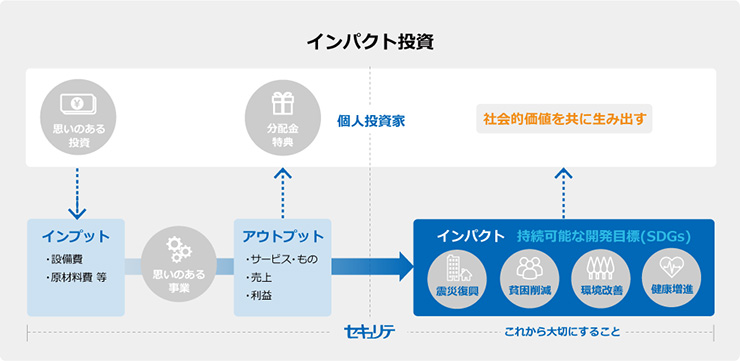 経済的なリターンを求めるだけではなく、それぞれの地域で抱える課題や貧困や環境などの社会的な課題に対して皆様からの出資を通じて解決しようとする、経済的な価値と社会的な価値の両方を追求する新しい投資の仕組みです。