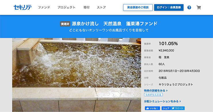 地元兵庫県の「源泉かけ流し 天然温泉 蓬莱湯ファンド」。蓬莱湯は、セキュリテで知る前から行ったことがある銭湯です。身近に通っているところが、セキュリテのファンドを出していました。特典の入湯券を持って出かけました。こういうのは楽しみで一番印象に残っています。